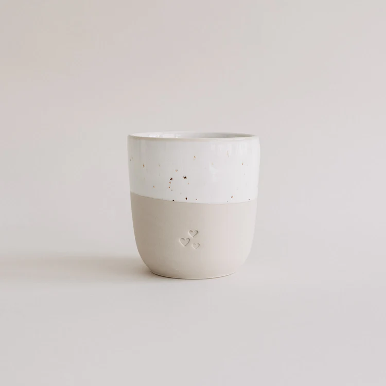 Natürlicher Kontrast: Die Kombination aus der glatt weiß glasierten Oberseite und dem naturbelassenen, matten Boden verleiht dem Becher einen modernen, erdigen Look.