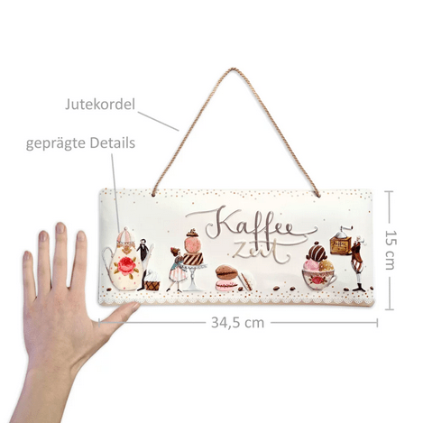 Das Schild wurde von der bekannten Künstlerin Silke Leffler illustriert und fängt die Freude am Kaffeegenuss charmant ein. Das Motiv zeigt alles, was das Kaffeeherz begehrt:
