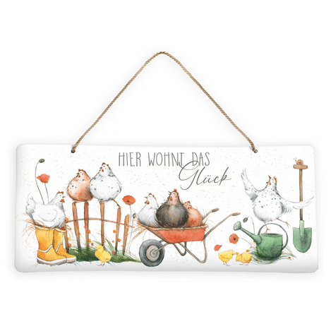Die Illustration der Hühnerbande fängt den Charme des Landlebens und die lustigen Eigenheiten von Hühnern ein. Typisch für die Schilder dieser Serie: