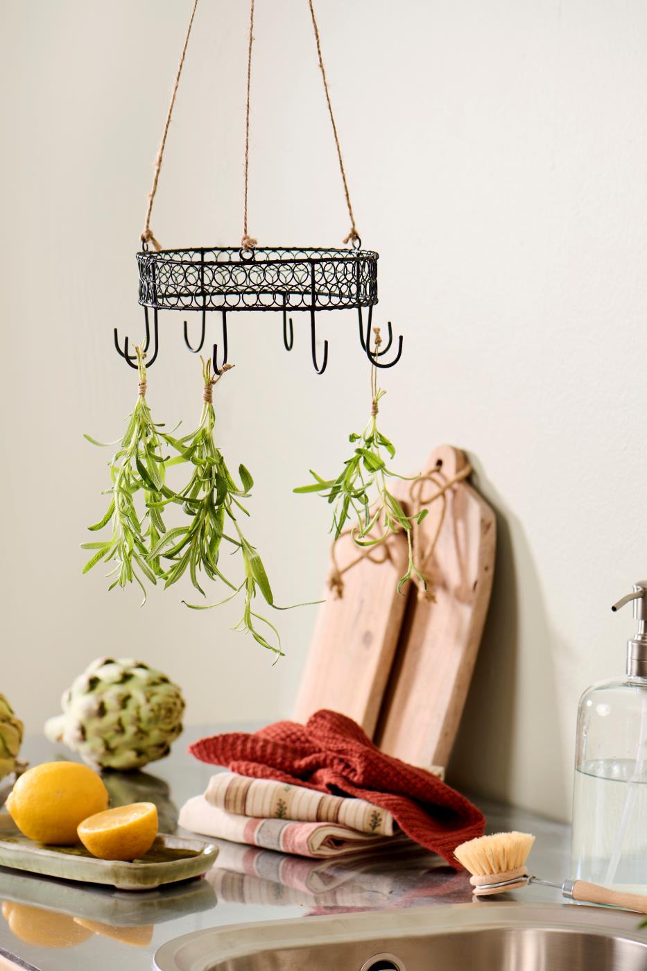 In der Küche: Nutze ihn als klassische Kräuterkrone zum Trocknen von Lavendel, Rosmarin oder Thymian. Auch kleine Tassen, Siebe oder Trockentücher finden hier ihren festen Platz.