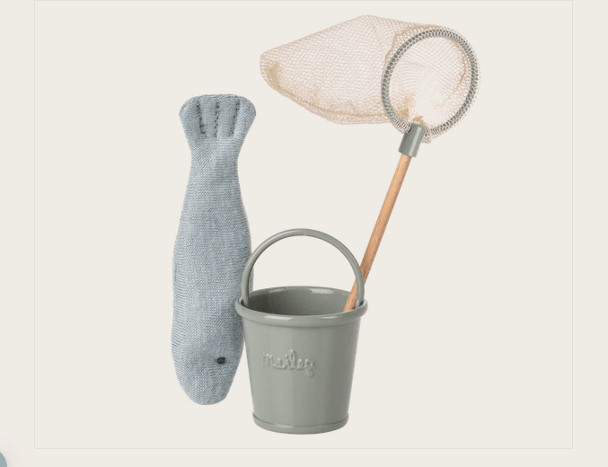 Detailverliebtes Design: Wie von Maileg gewohnt, besticht jedes Teil durch seine authentische Optik – vom Holzgriff des Netzes bis zum glänzenden Eimer.