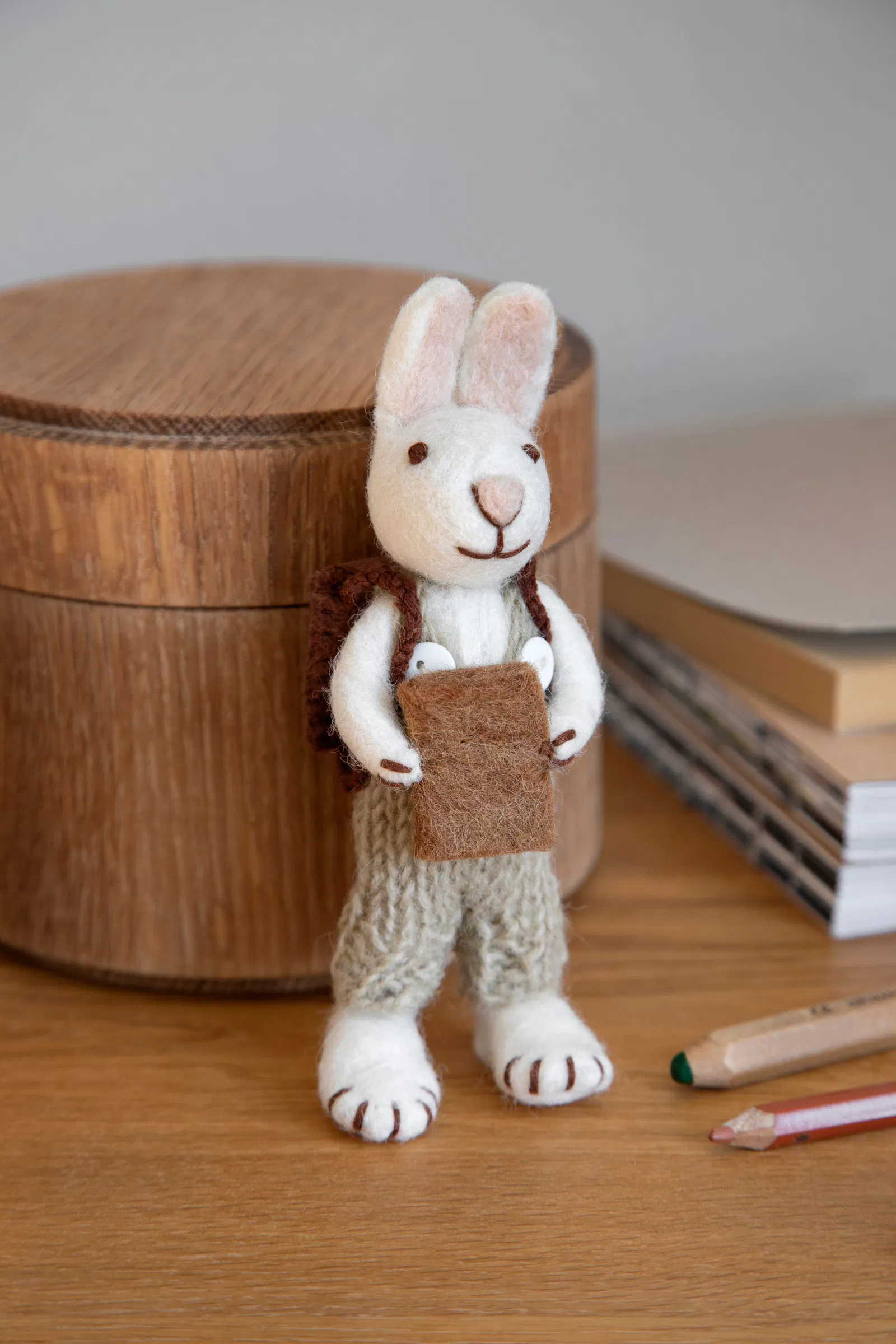 Bereit für das Frühlings-Abenteuer: Der Filz-Hase „Schüler“ von Gry & Sif